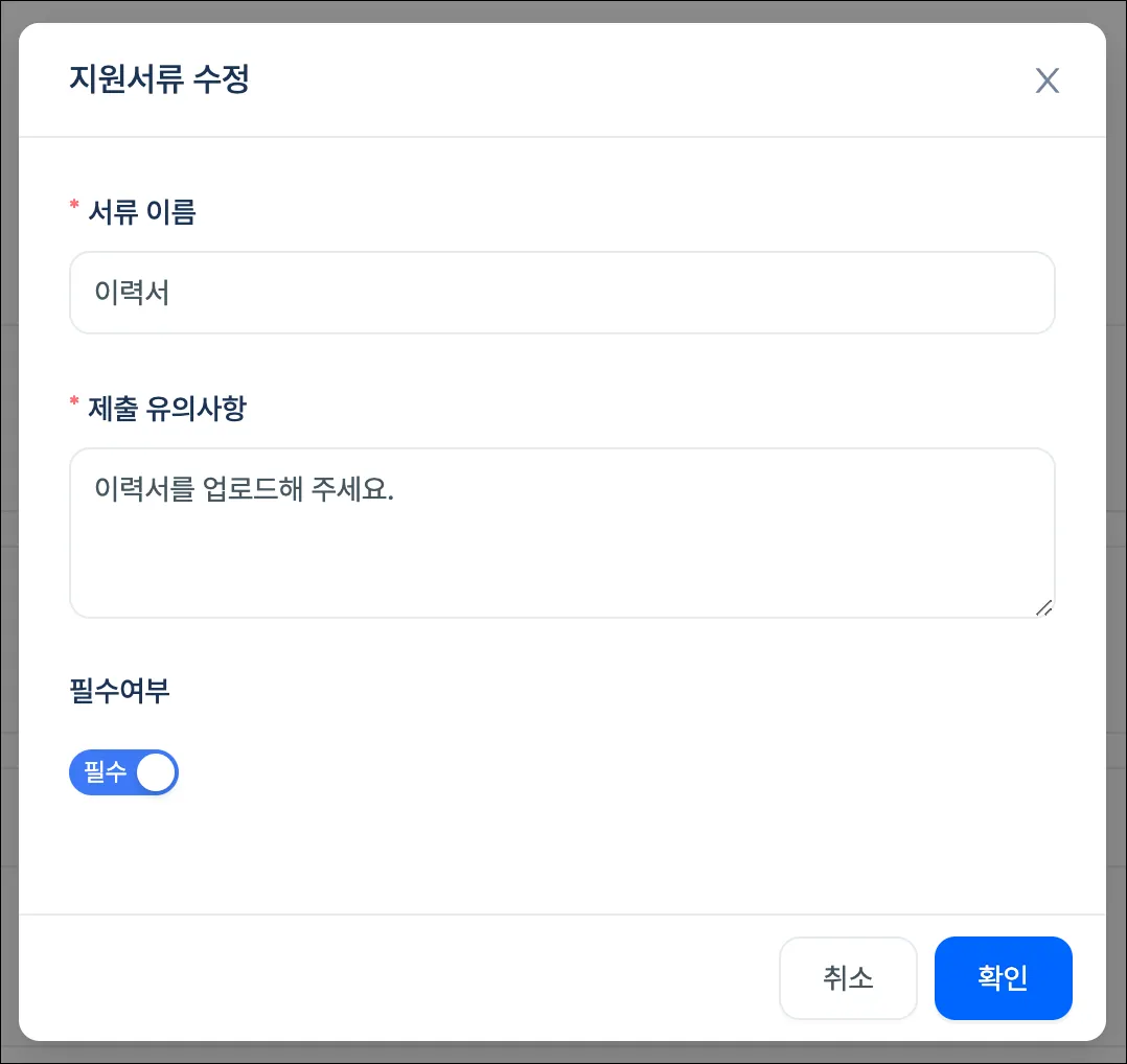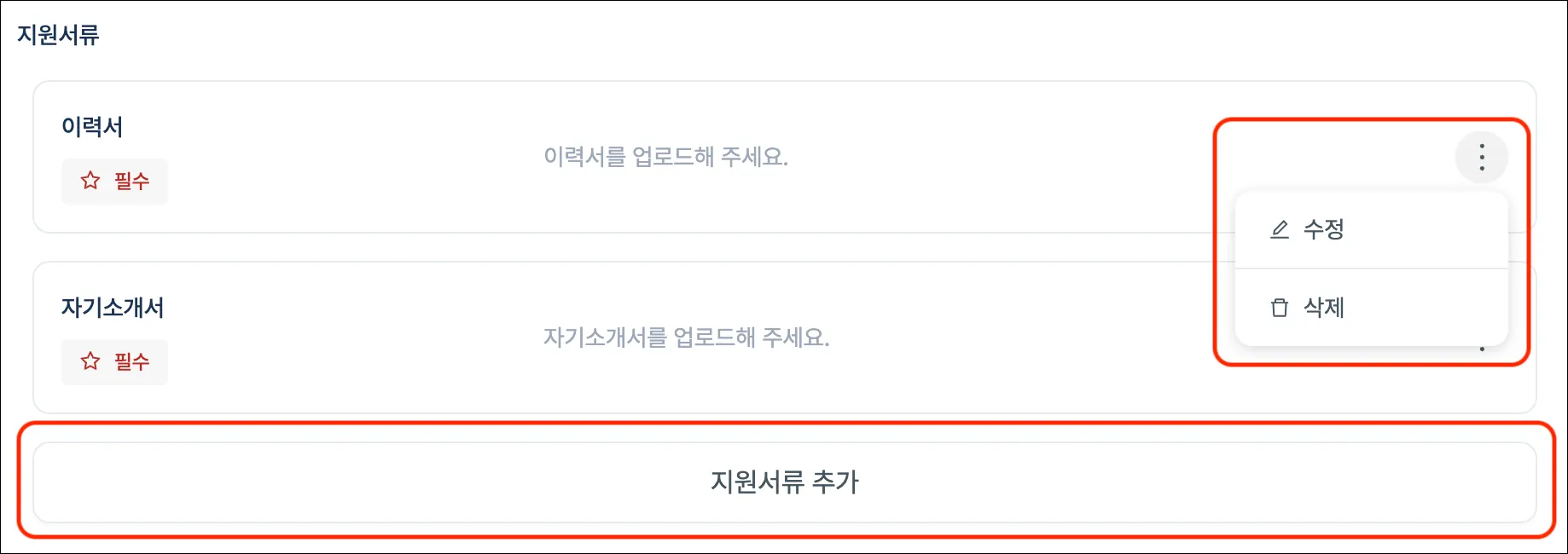 지원서류 : 원하는 지원서류를 추가/삭제 가능합니다.