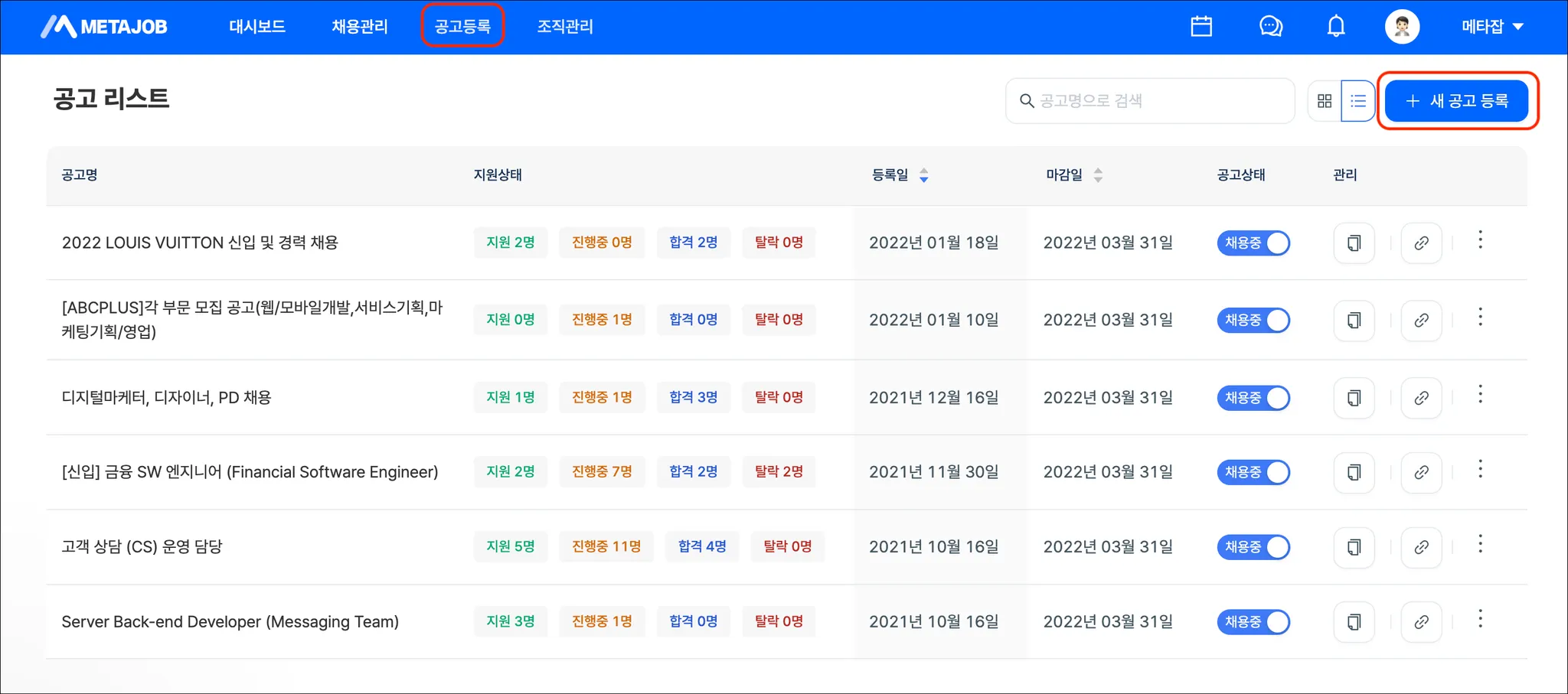 메뉴에서 “공고등록" 버튼을 통해 새 공고를 등록 할 수 있습니다.