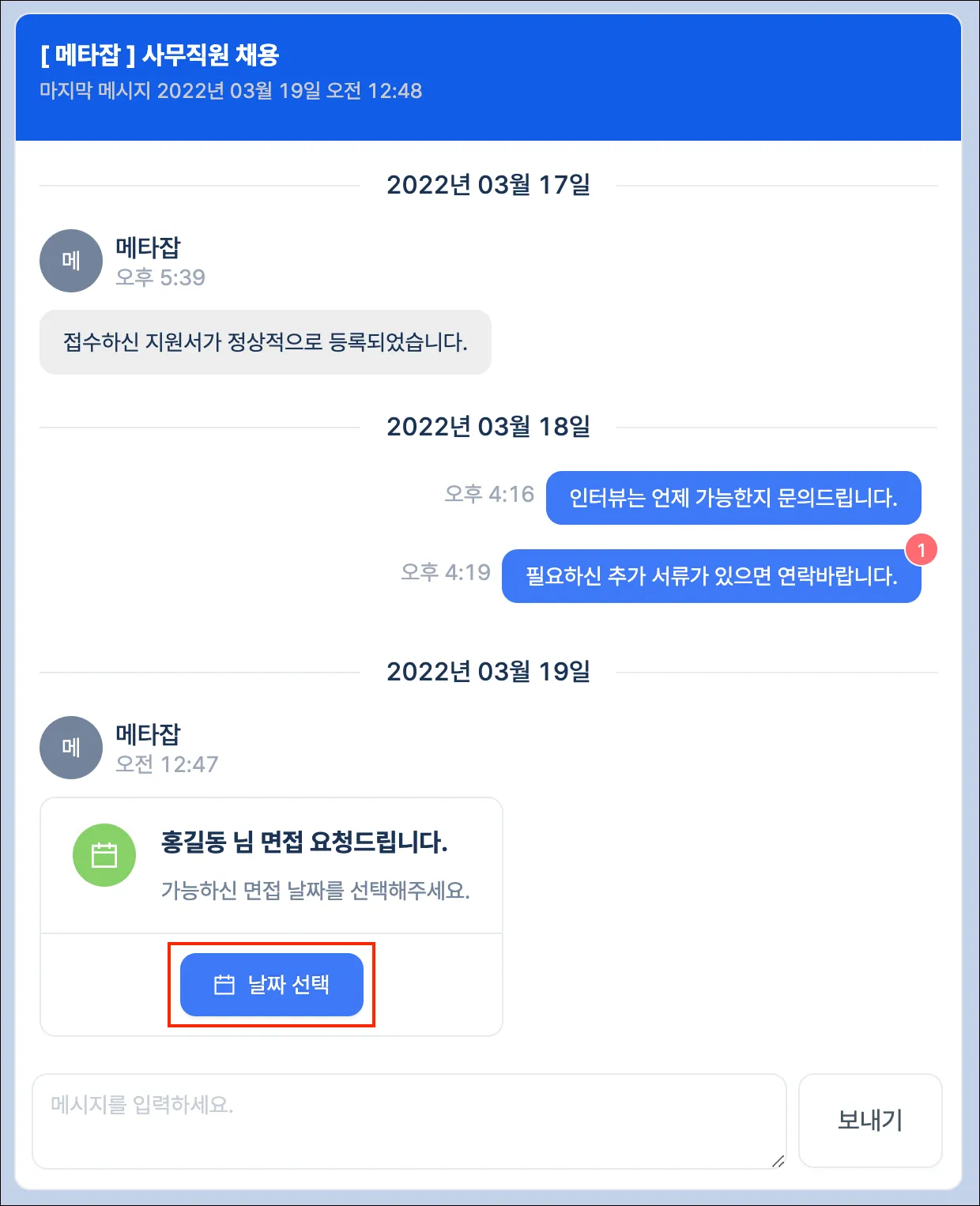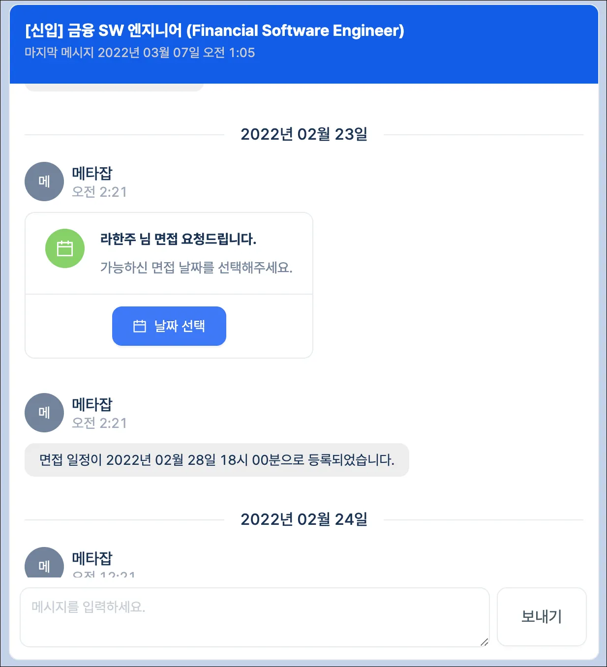 지원자는 메타톡을 이용해서 인터뷰 날짜를 결정합니다.
