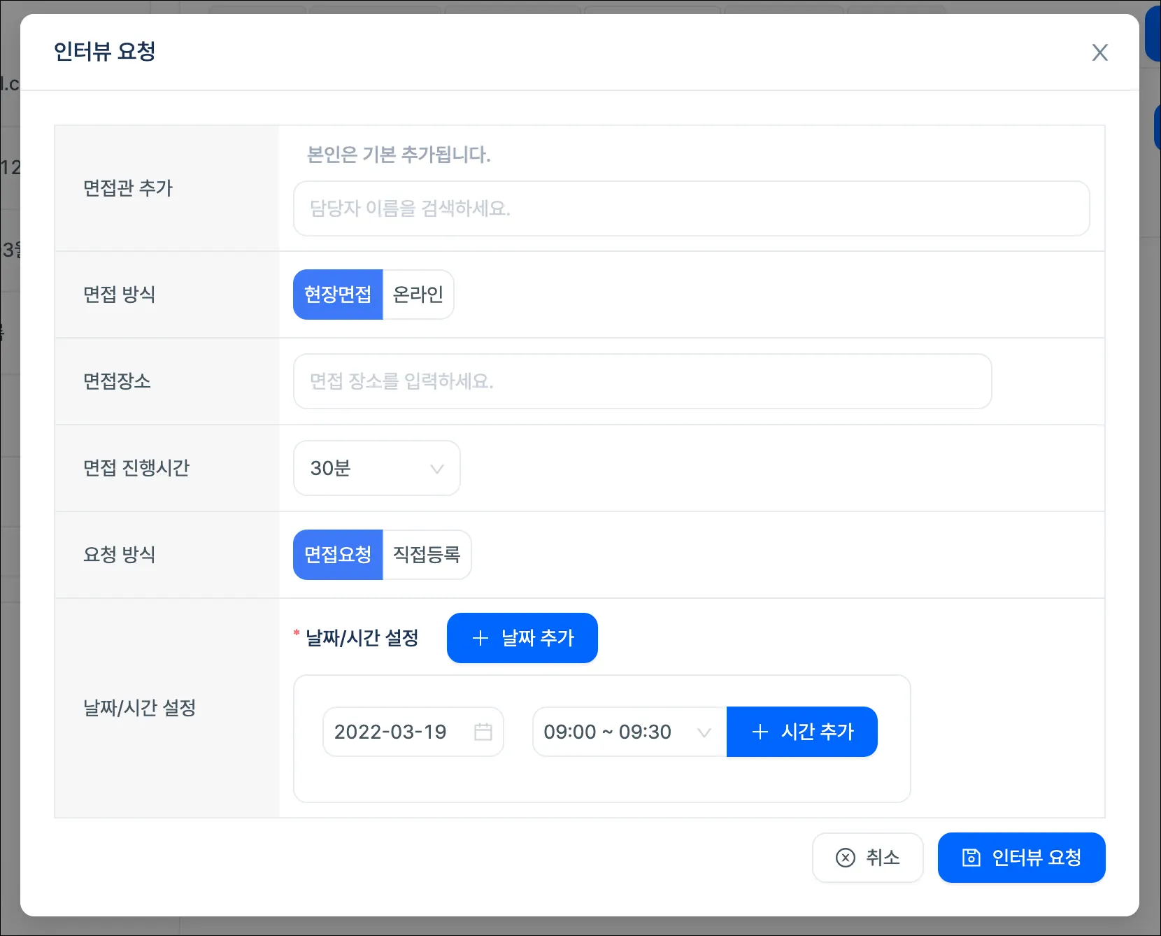 직접등록 : 미리 지원자와 면접 일정을 확정한 이후에 등록하는 경우입니다.