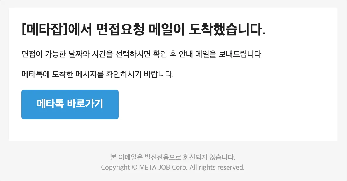 면접 일정이 확정되면 지원자에게 메타톡(메일, 카카오톡, SMS)으로 일정을 알려줍니다.