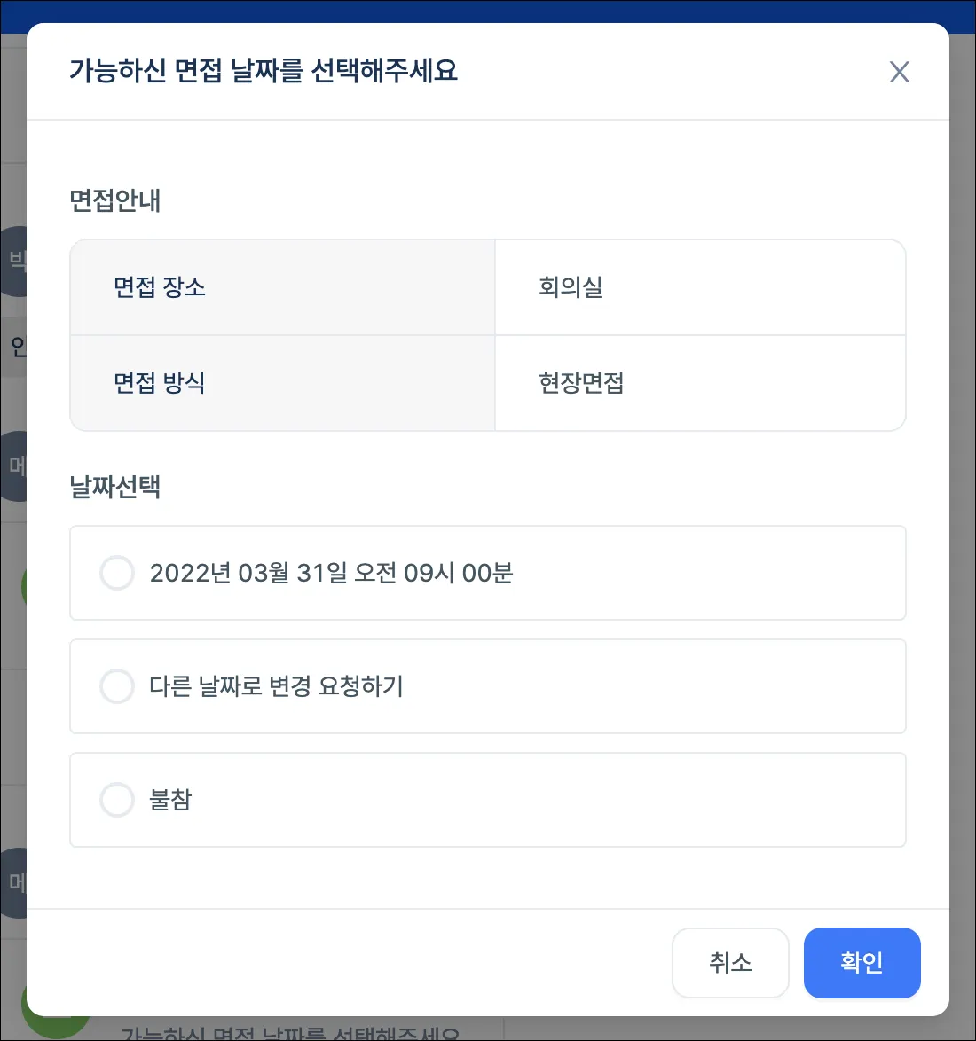 면접요청 : 지원자가 원하는 날짜를 선택하는 방식입니다.