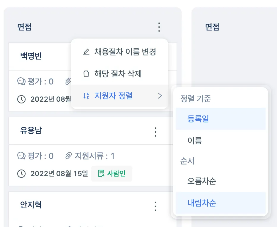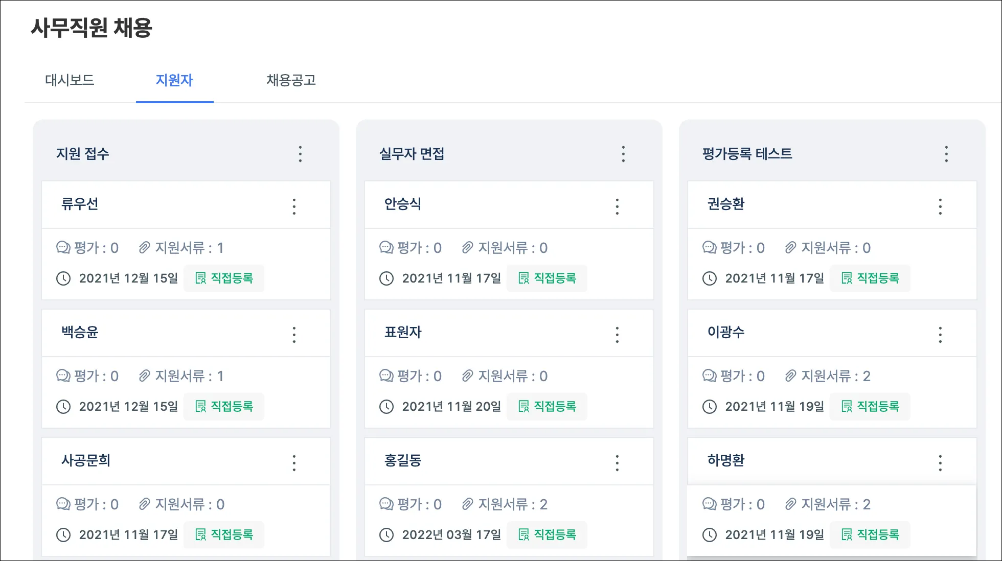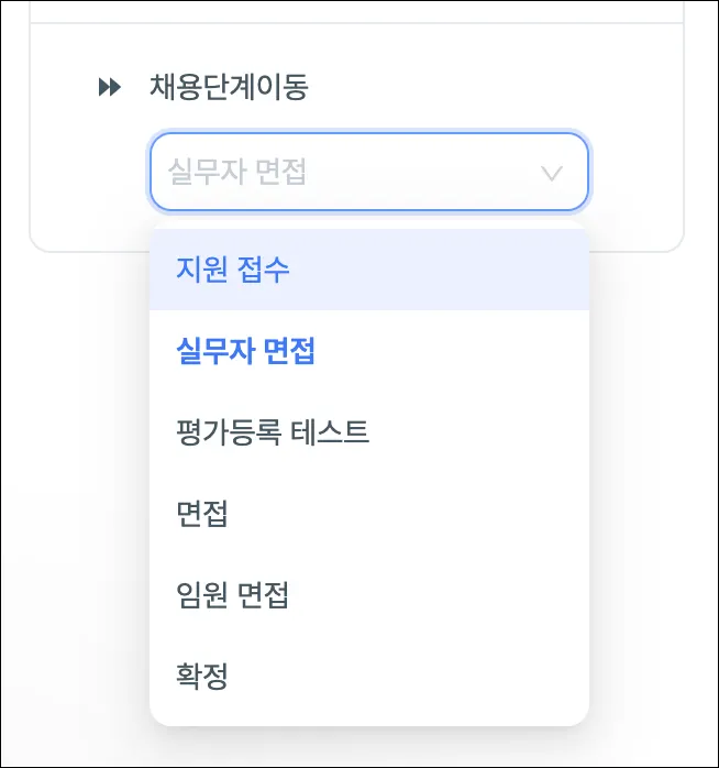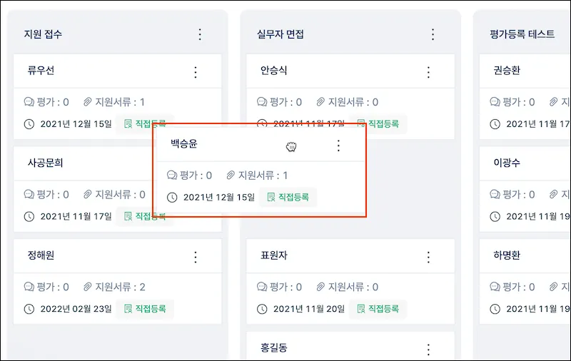 지원자 카드 상단을 클릭해서 드래그하면 원하는 채용단계로 이동이 가능합니다.