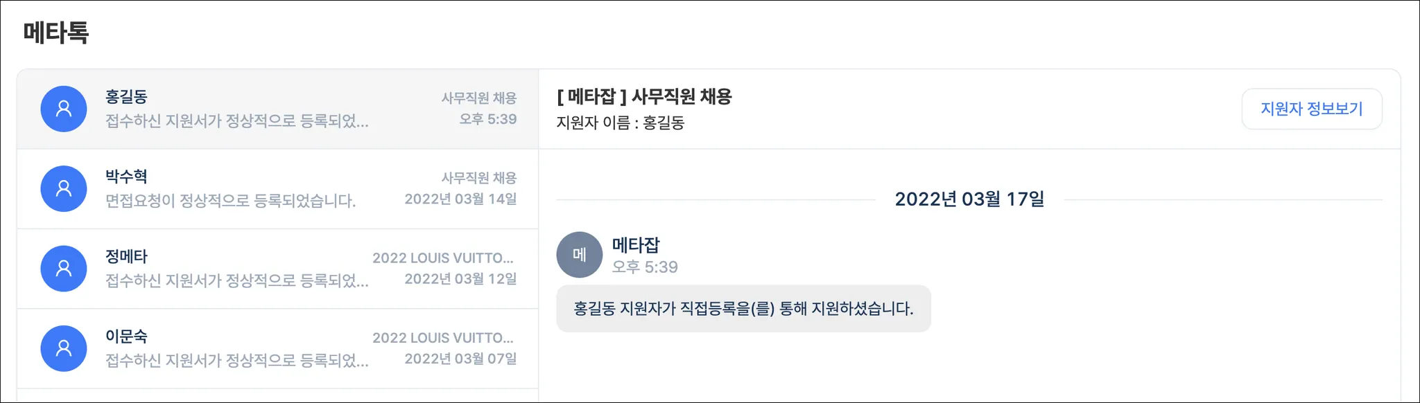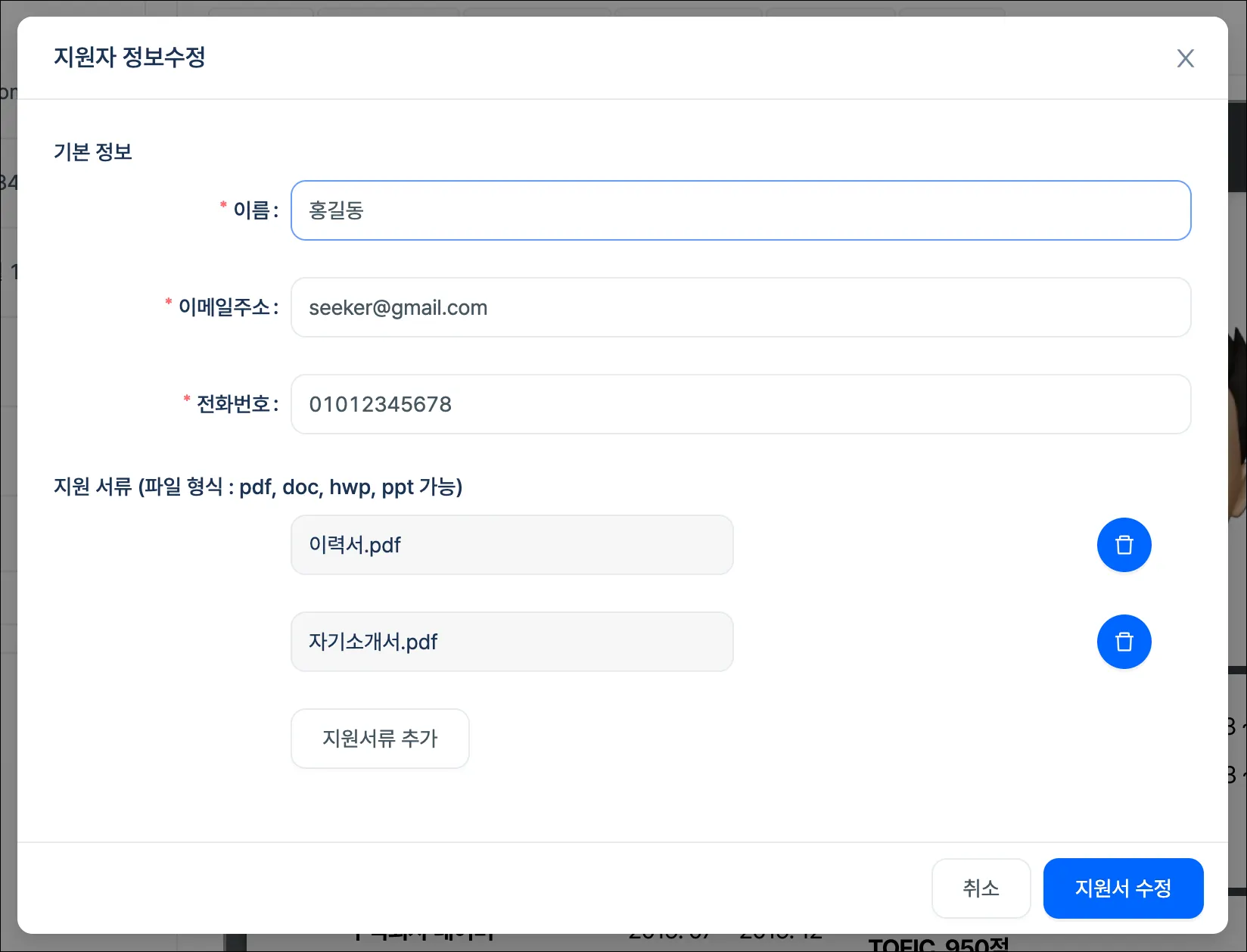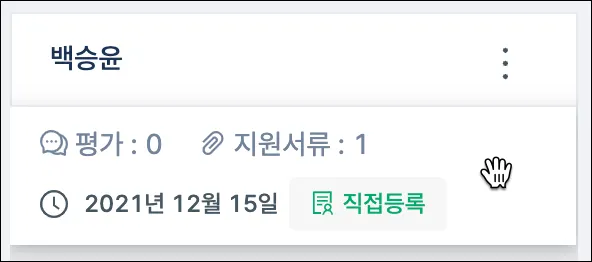 지원자 카드 하단을 클릭하면 상세정보로 이동합니다.