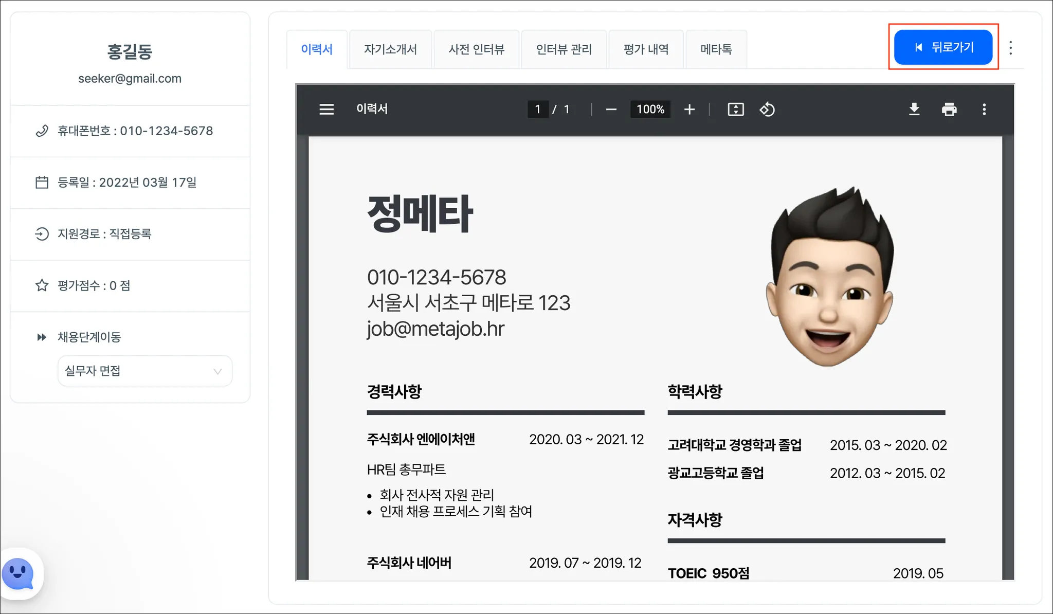 지원자 상세화면 : 뒤로가기 버튼을 클릭하면 리스트로 이동합니다.