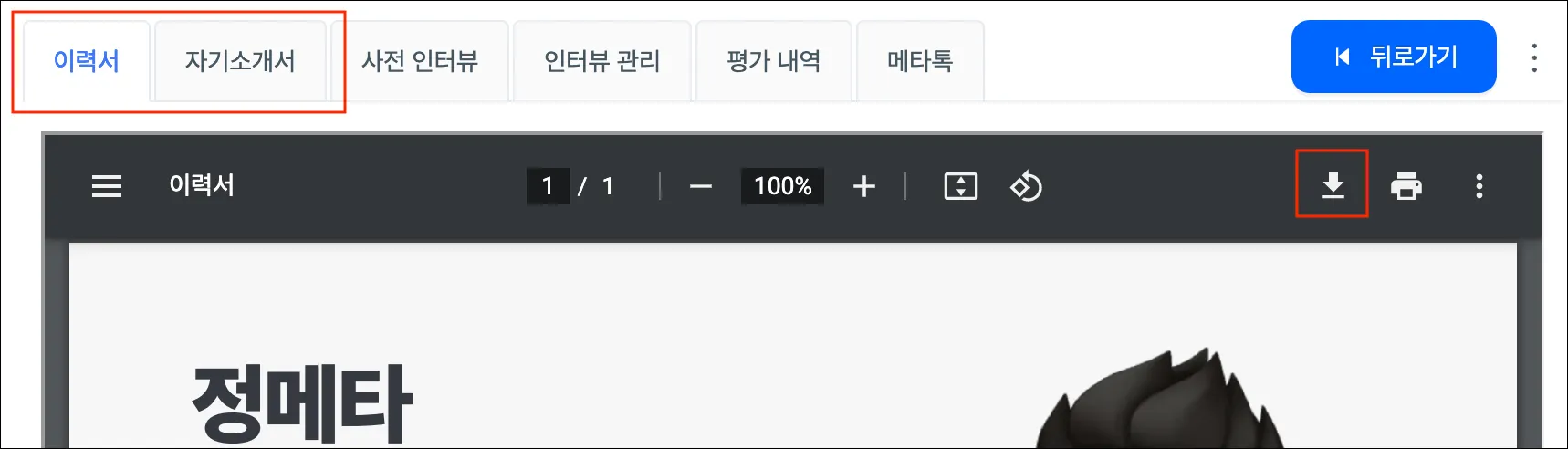 지원자가 업로드한 지원서 탭을 선택하면 바로 확인할 수 있습니다.