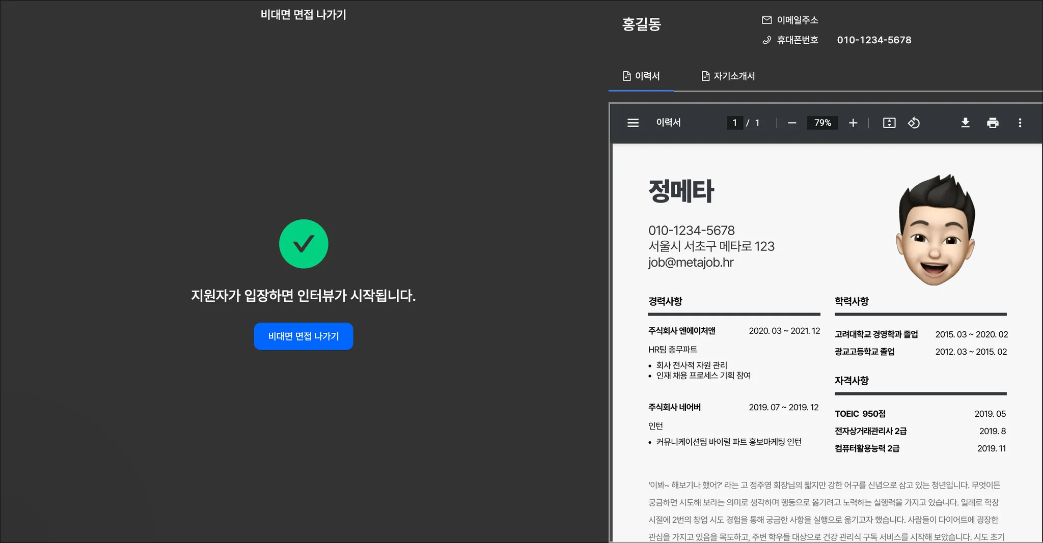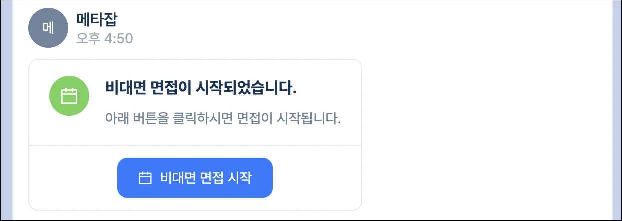 인터뷰 시작하기를 클릭하면 지원자에게 비대면 인터뷰 시작 알림을 메타톡으로 보냅니다.